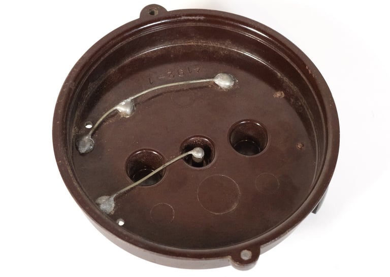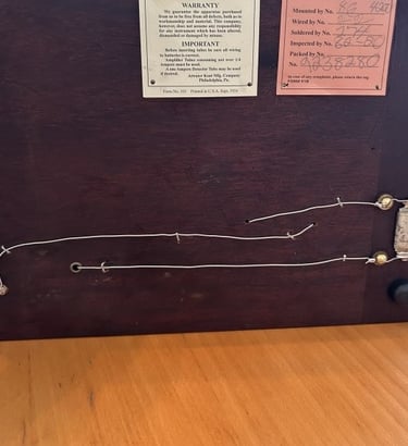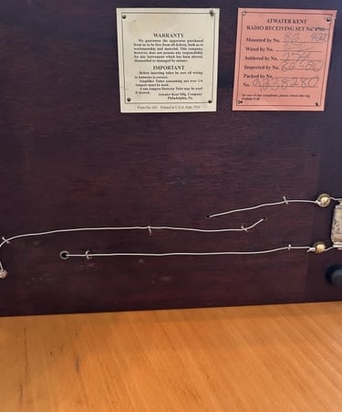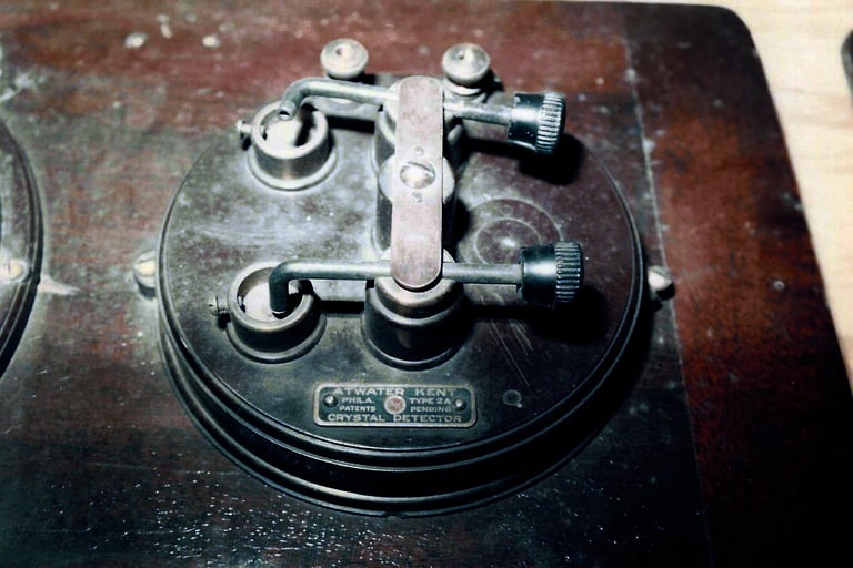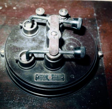 A photo of the reportedly only known surviving factory-constructed Atwater Kent crystal set—a non-commercial receiver originally provided only to hospitals—and a close-up of its unique Type 2A crystal detector, sourced from an examination of a 1930s traveling exhibit. For more information on the exhibit and the crystal set history, see the August 1989 issue of Antique Radio Classified (ARC), specifically the article titled 'Atwater Kent Crystal Sets - Part 1: Did Atwater Kent Manufacture a Crystal Set?' by Ralph Williams.