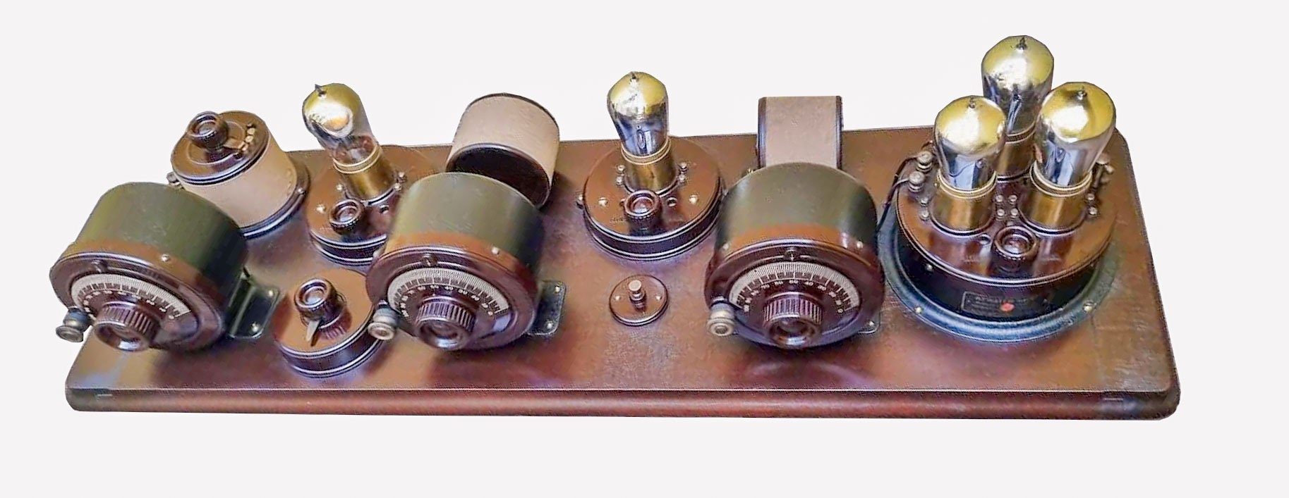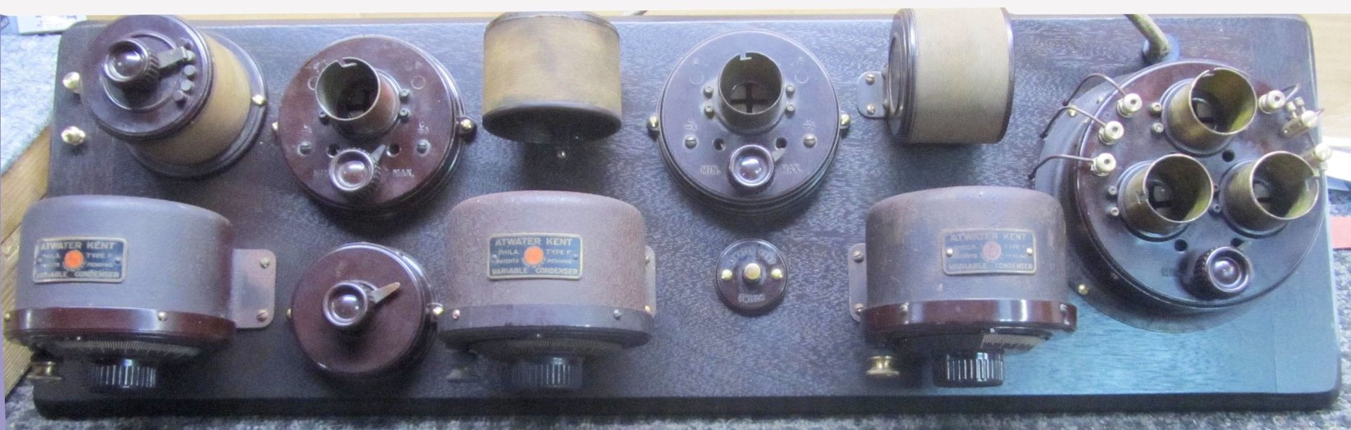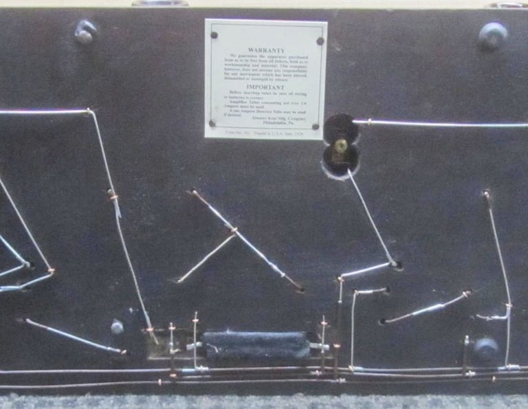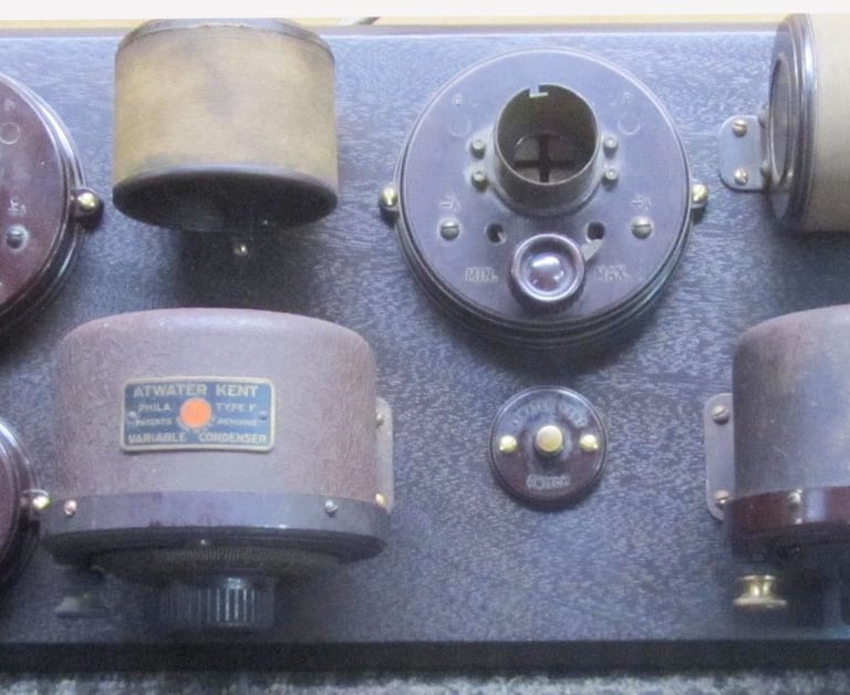 The Atwater Kent No. 4550 (& 4560) Model 10B Receiving Set was a minor but important revision in the celebrated three-dial breadboard series, introduced around 1924. Maintaining the core architecture of the Model 10A, this set featured the advanced five-tube Tuned Radio Frequency (TRF) circuit with two RF amplification stages, one detector, and two AF amplification stages, typically powered by four UV-201A tubes and one UV-200 detector tube. The key distinguishing feature of the Model 10B lay in its physical layout and operation: Atwater Kent engineers replaced the vertical mounting of the Model 10A with an orthogonal (sideways or horizontal) mounting of the RF coils. More significantly for the operator, the 10B added a three-point antenna tap switch on the first RF coil. 4550 Brown / 4560 Black. Board dimensions 31.5" x 10".