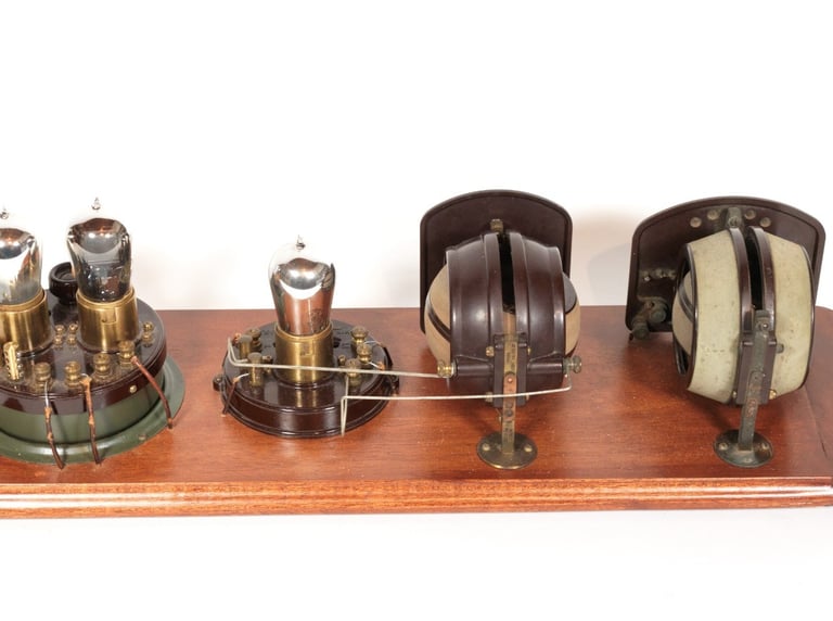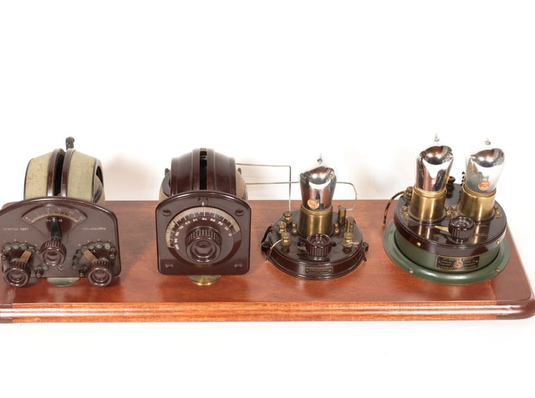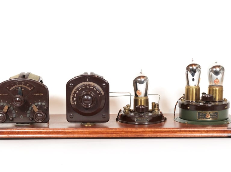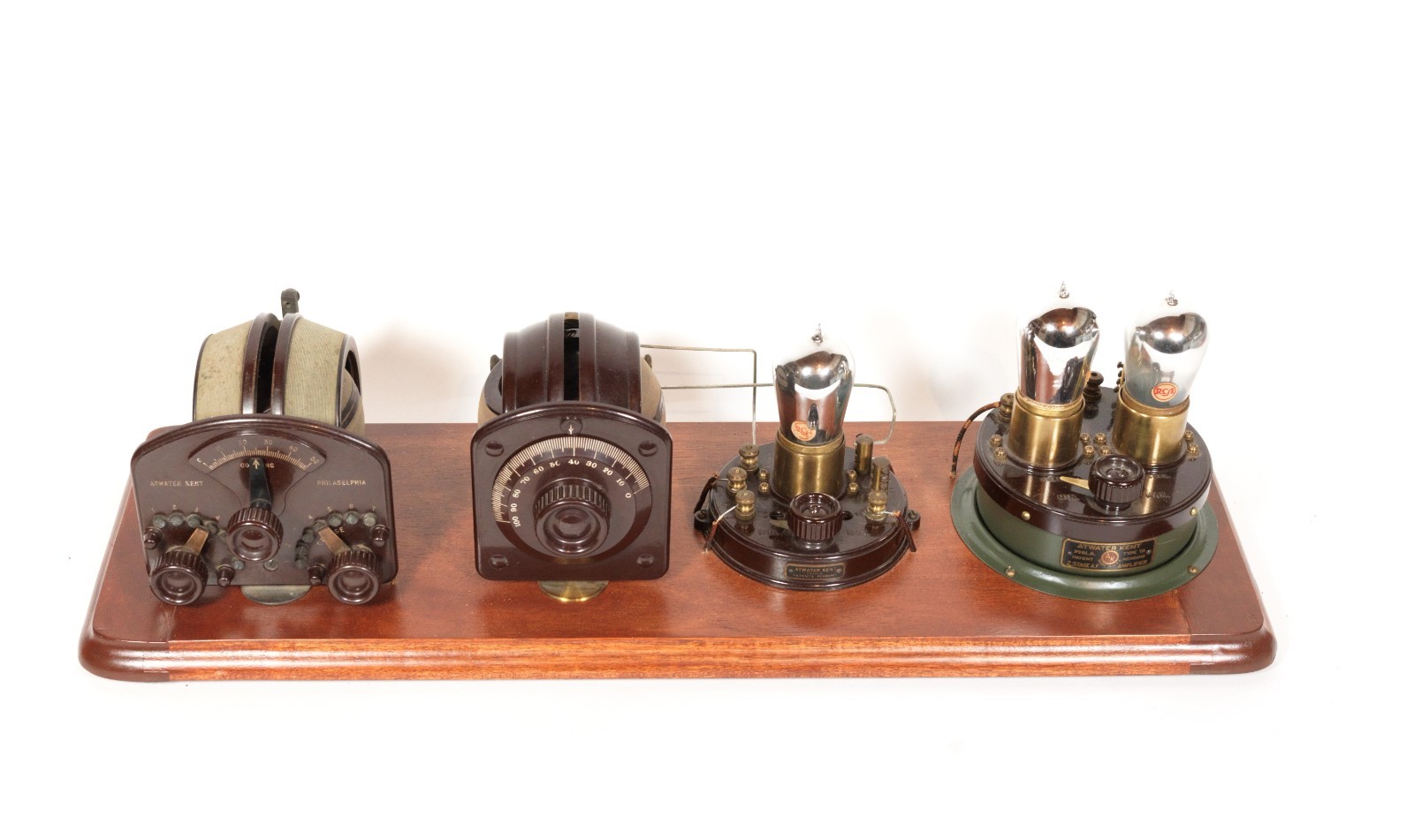 The Atwater Kent No. 3975 (Model 4) Receiving Set was one of the earliest and rarest in the legendary "breadboard" line, introduced in early 1923. This set was a three-tube Tuned Radio Frequency (TRF) circuit, comprised of a detector and two stages of audio amplification, and it featured four main components on the board: a variocoupler, a variometer, detector and the amplifier island. Unlike the Model 1, 2, and 3, the Model 4 was engineered to be sold as a complete system that was regenerative from the factory. Board dimensions are 24-1/2" x 8-1/2".