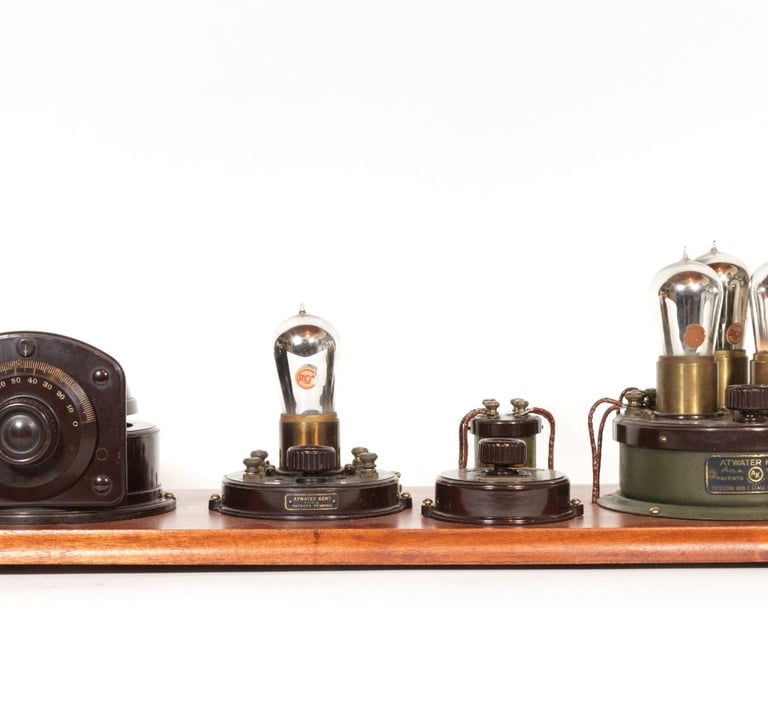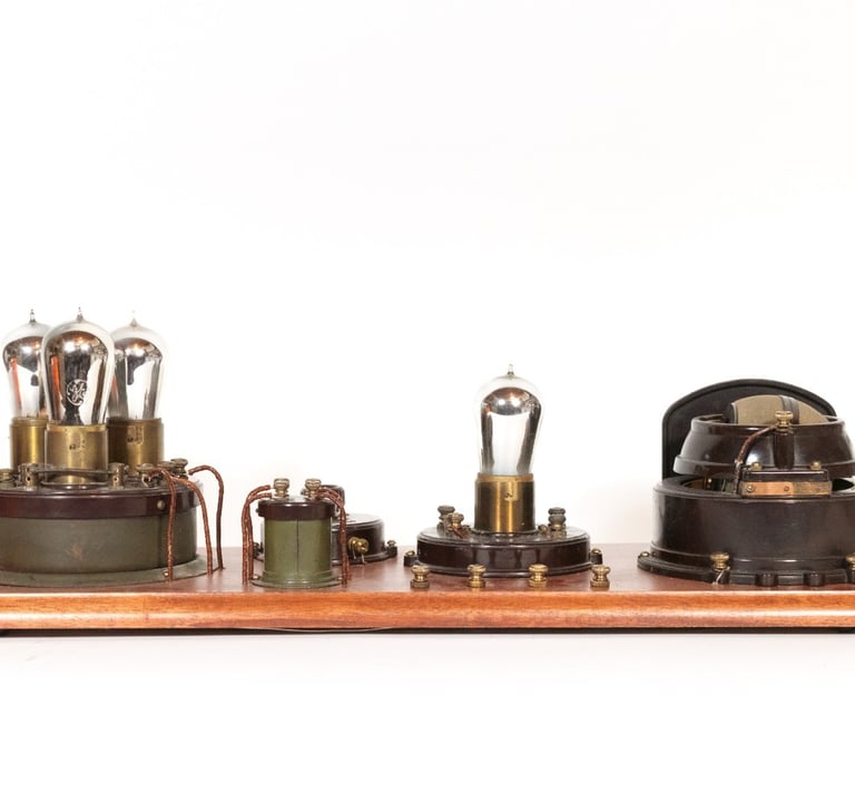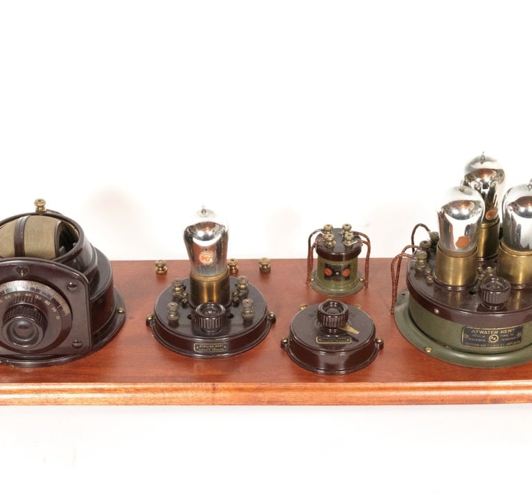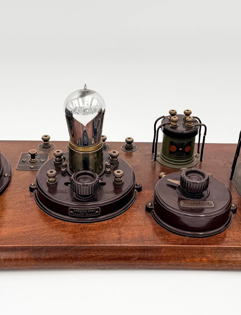 The Atwater Kent No. 4052 (Model 6) Receiving Set was a significant evolution in the breadboard line, introduced in 1923 to meet consumer demand for greater sensitivity and volume as the number of broadcasting stations rapidly increased. This set was a four-tube design, representing the first major component upgrade over the three-tube Model 2 and Model 3. Its circuit was a Tuned Radio Frequency (TRF) configuration featuring one Radio Frequency (RF) amplification stage, a detector, and two stages of Audio Frequency (AF) amplification. The tube line-up utilized one UV-200 detector tube and three UV-201a tubes for the amplification stages (one RF and two AF). Board dimensions are 24-1/2" x 8-1/2".