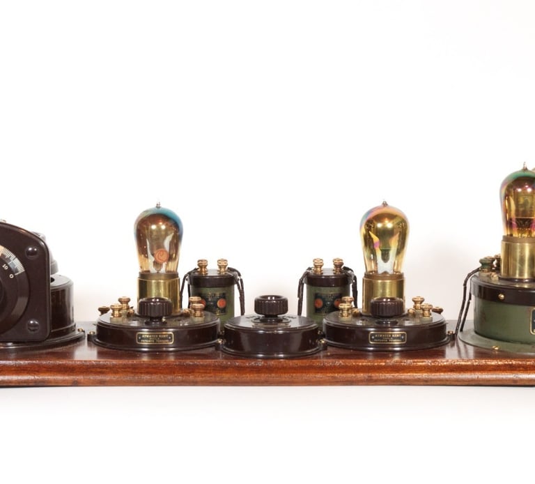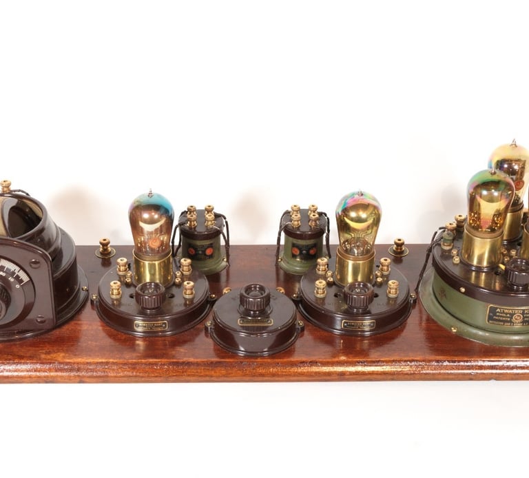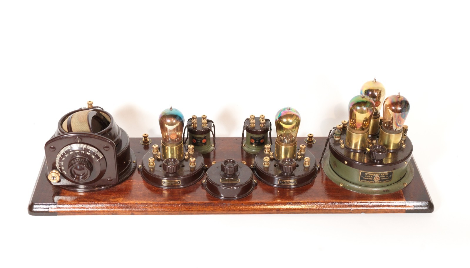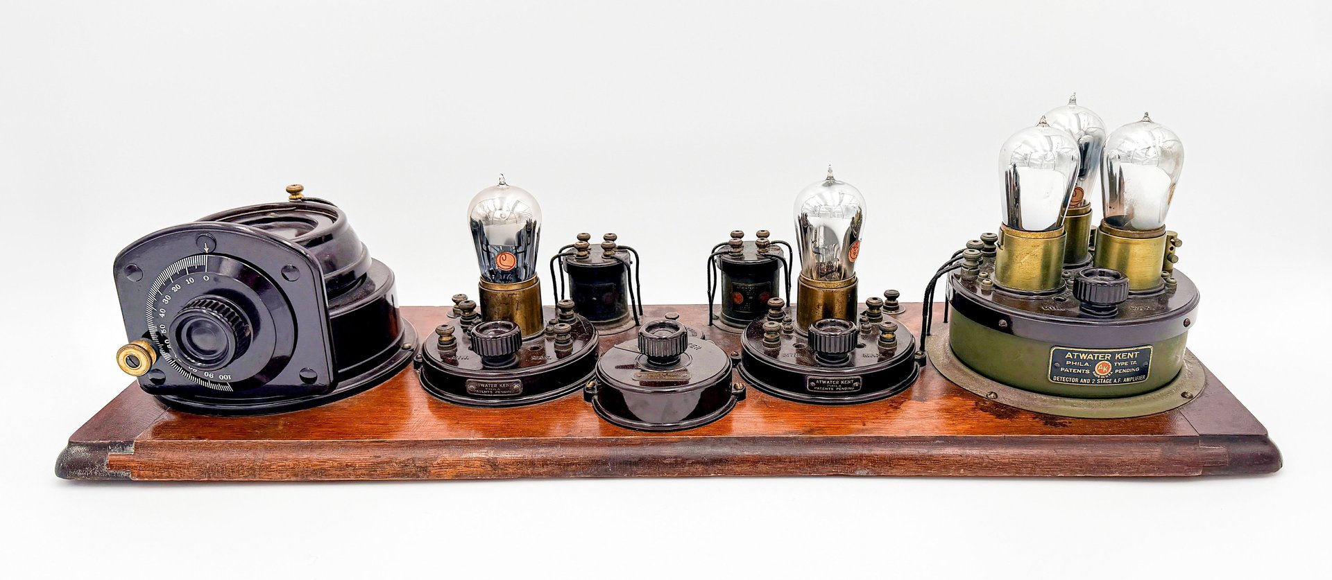 The Atwater Kent No. 4066 (Model 7) Receiving Set, introduced in early 1923, this model was a five-tube set, the first in the line with this configuration, operating on a Tuned Radio Frequency (TRF) circuit. Its massive improvement over the Model 6 (four-tube) and earlier models was the addition of a second Radio Frequency (RF) amplification stage, resulting in a configuration of Two RF Stages, one detector, and two Audio Frequency (AF) amplification stages. The tube line-up often comprised five UV-201a tubes (or four UV-201a and one UV-200 detector). By employing two tuned RF circuits, the Model 7 dramatically increased both sensitivity and selectivity, effectively eliminating the need for a regenerative circuit altogether