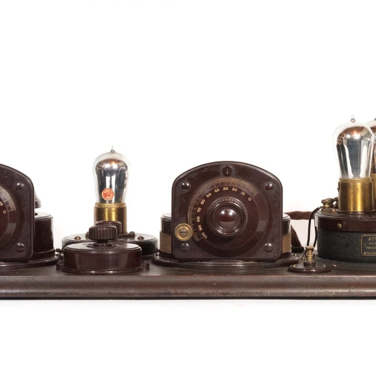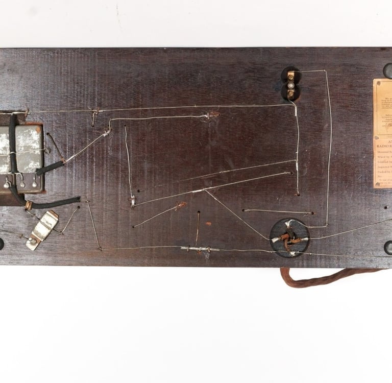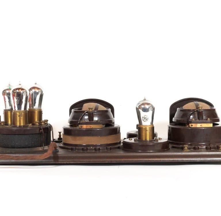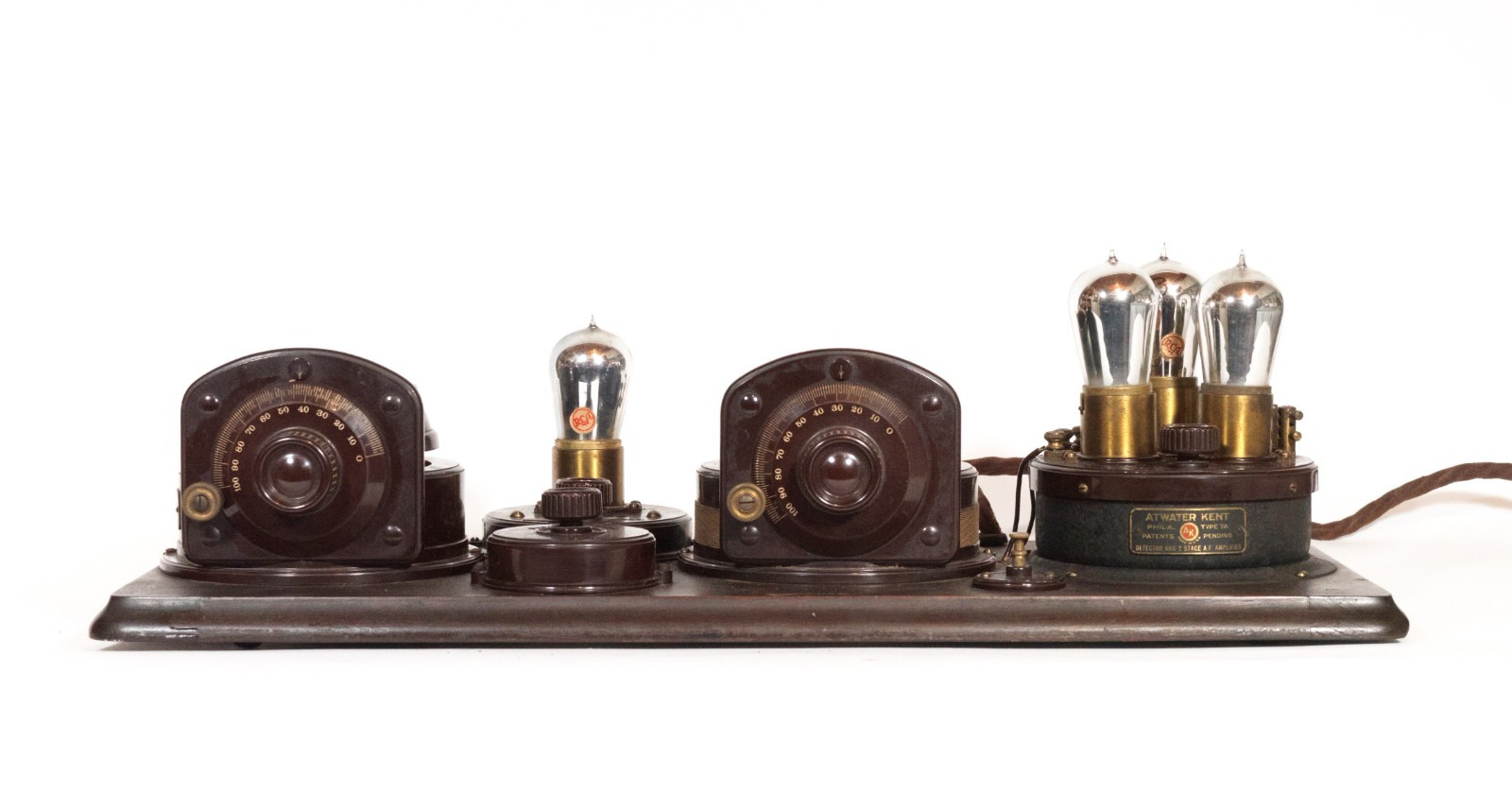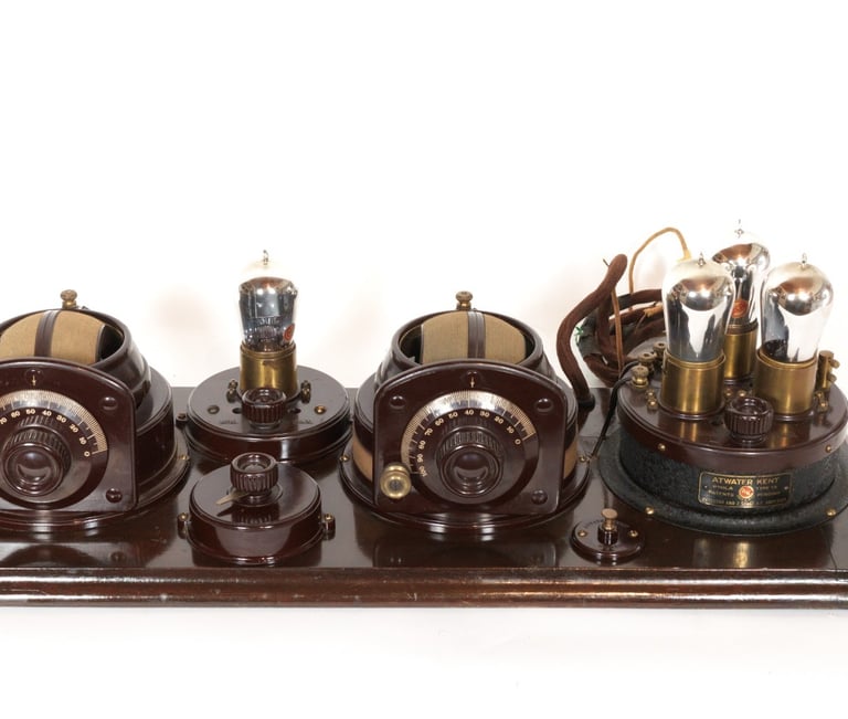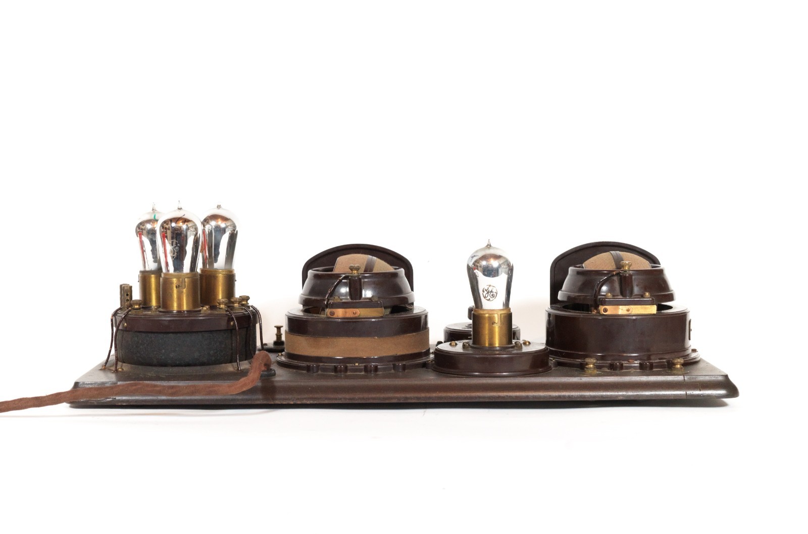 The Atwater Kent No. 4445 (Model 9) Receiving Set (known as the "long board" Model 9) was an important transition model, introduced briefly in October 1923 with an original price of $68.00. This set featured a four-tube circuit consisting of one Radio Frequency (RF) amplification stage, a detector, and two Audio Frequency (AF) amplification stages. The Model 9 returned to using a single RF stage, but used two inductive tuners (a Type 11 and a Coupled Circuit tuner), sometimes described as featuring a second variometer, to achieve a quasi-regenerative circuit that Atwater Kent hoped would be an improvement over prior designs without violating the critical regeneration patent.